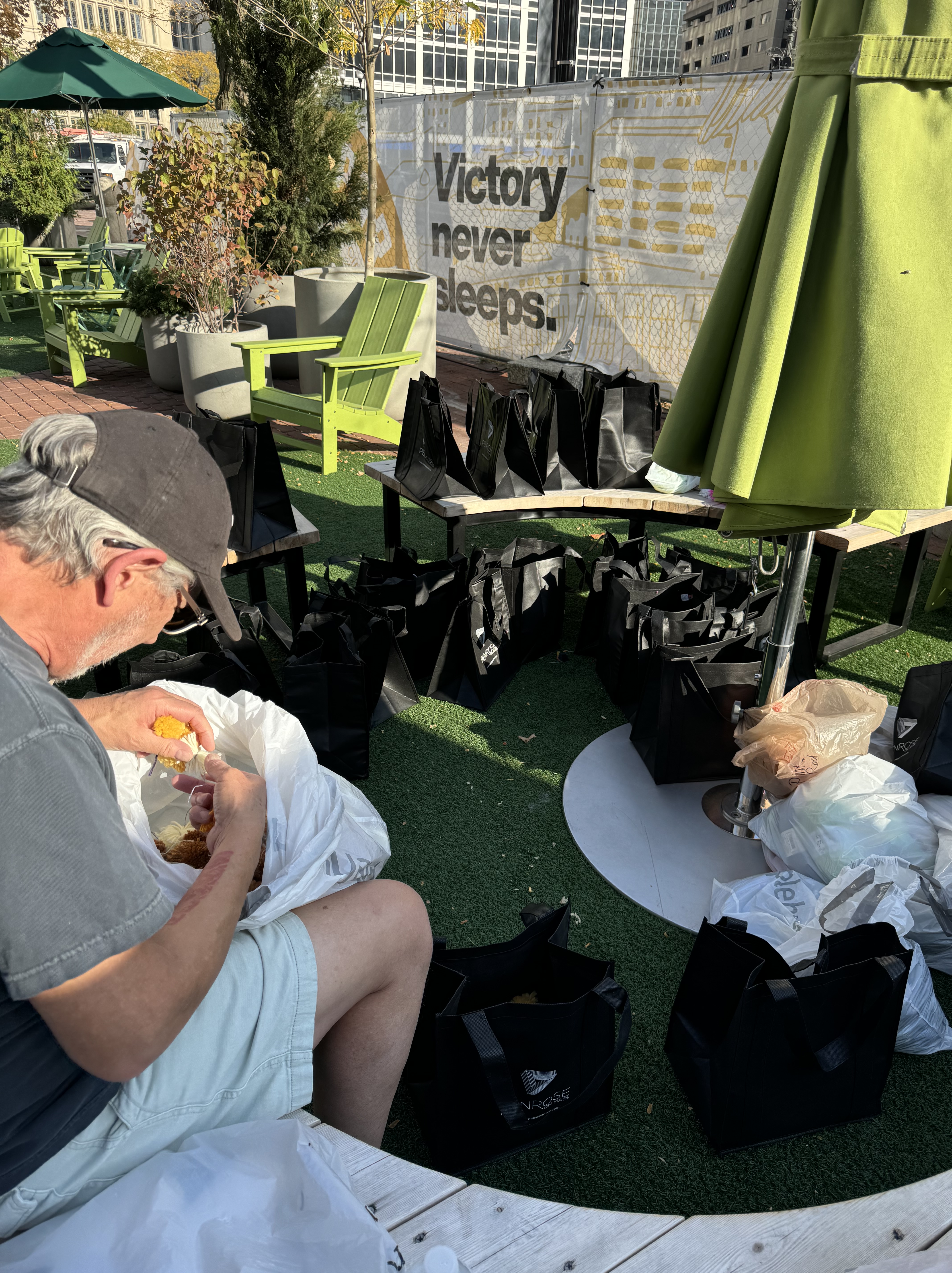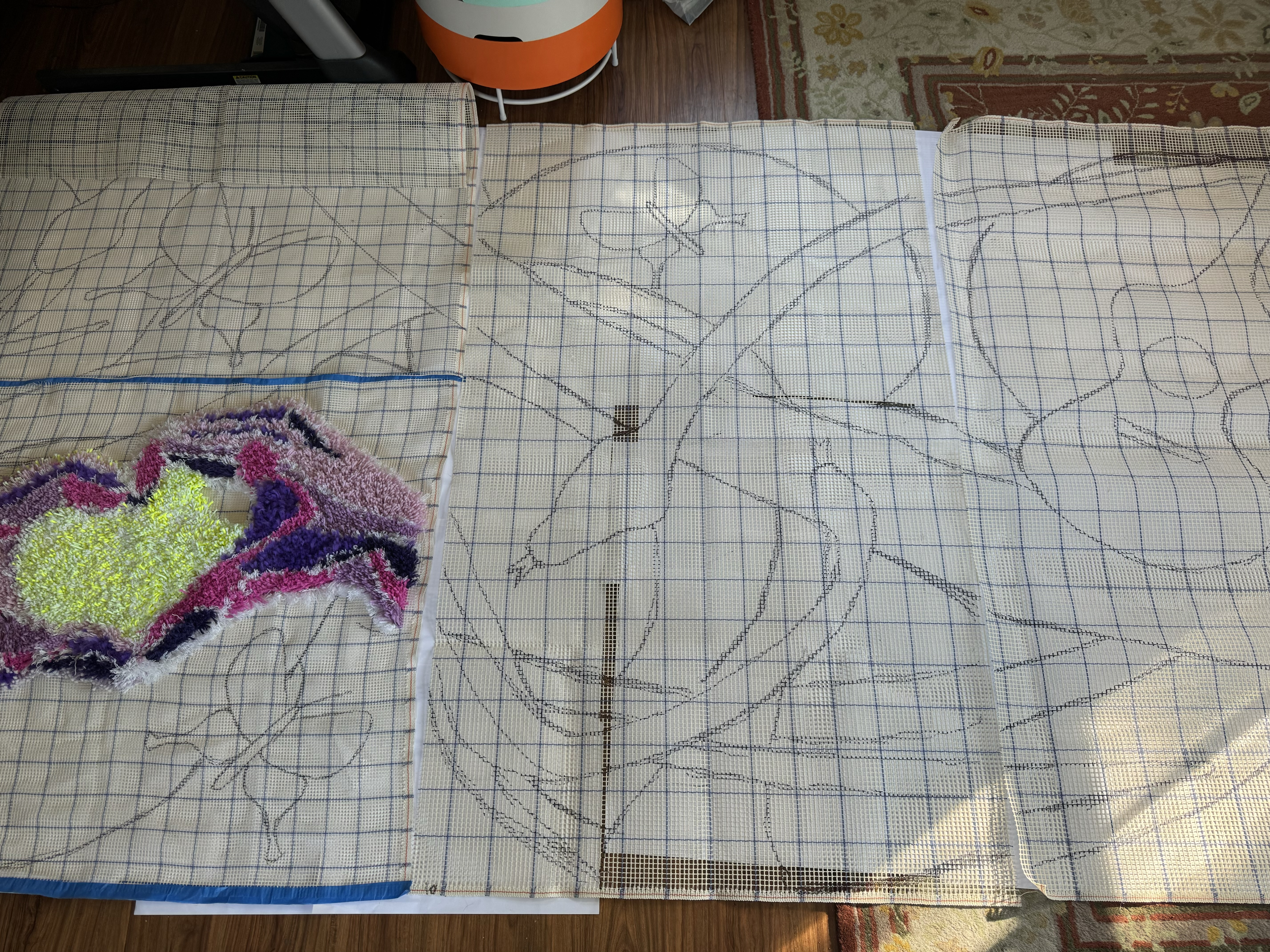Things are almost set for the November 1 opening of The Village. So many pompoms have been made, the hands are complete, the entire composition is mapped out on the latch hook canvas, pompoms are sorted into individual bags, and the online auction is being set up today!