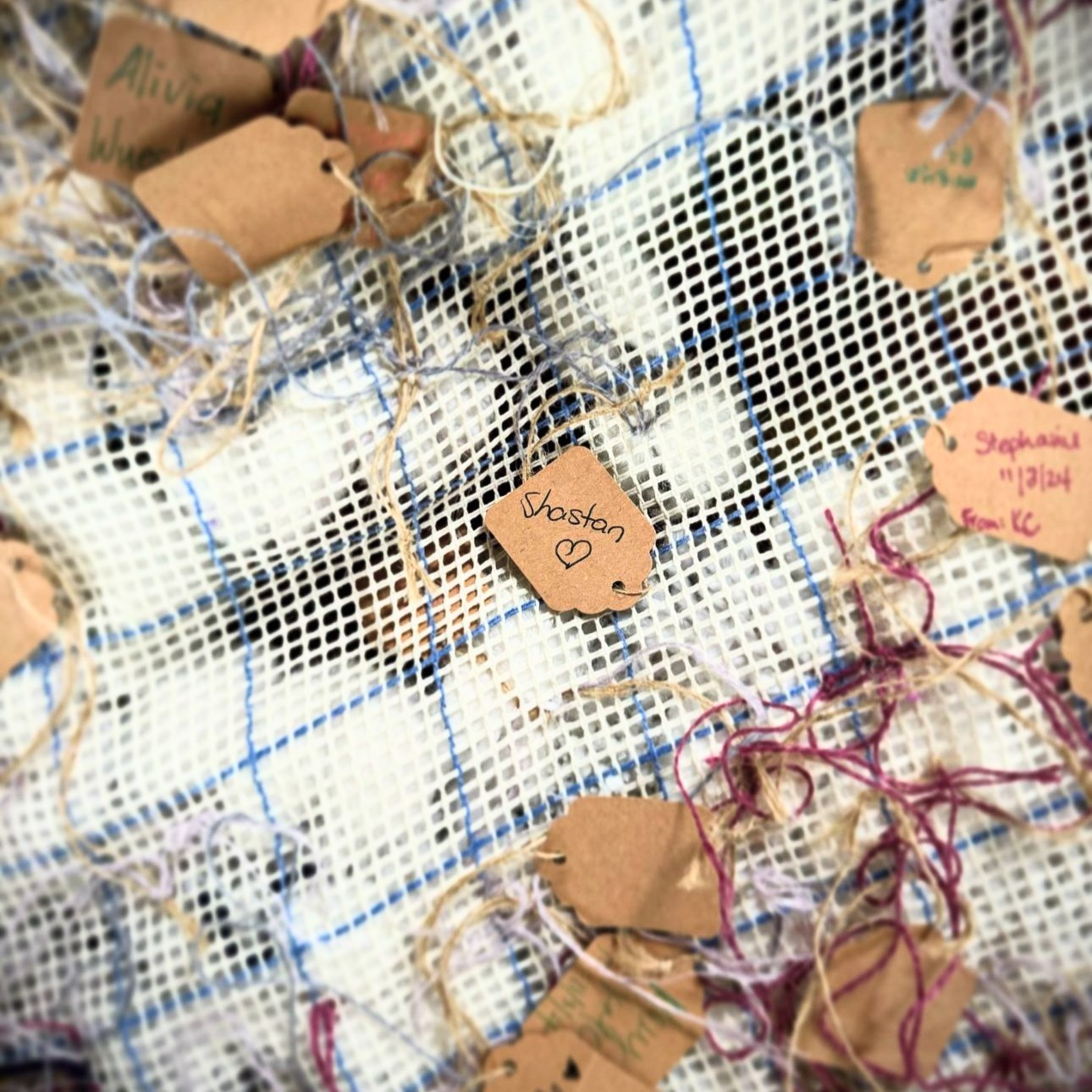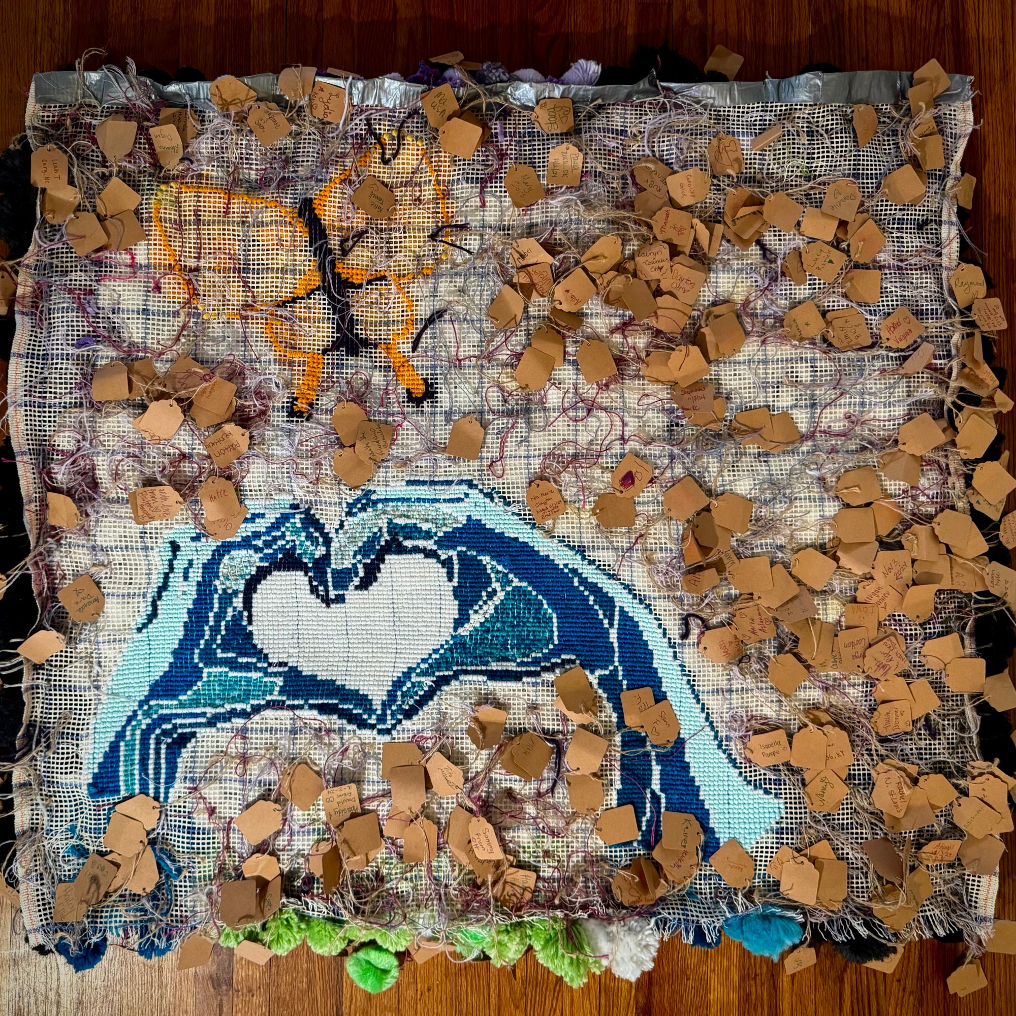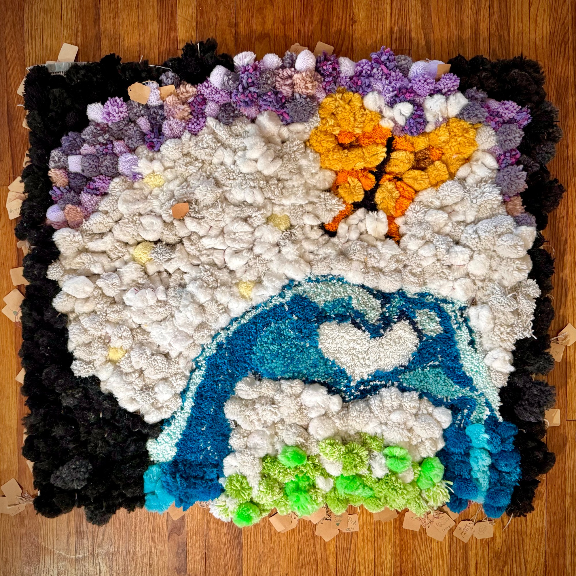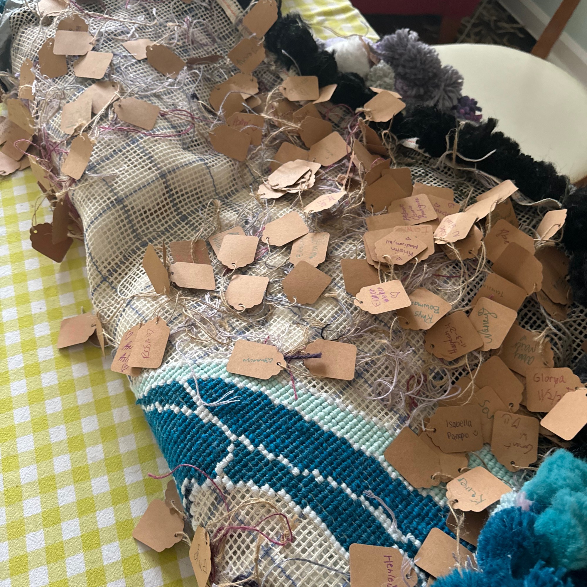 The brown pieces of paper on the back are names, dates, and sometimes messages written by participants. Individuals from all over Indianapolis made these pompoms and attached them to the canvases. This is the community’s record of and unity and creativity.