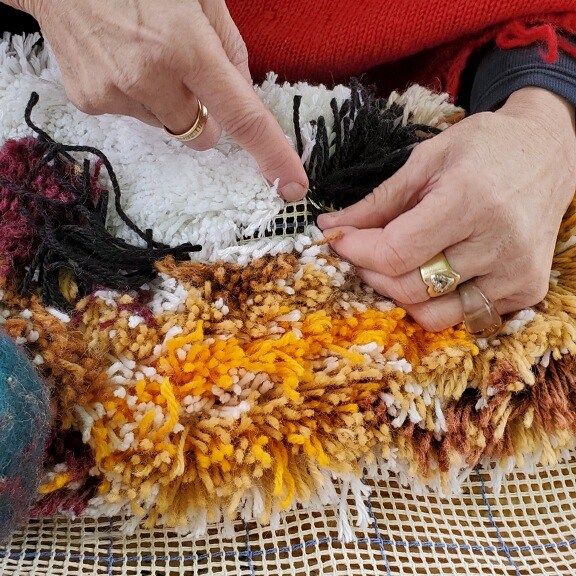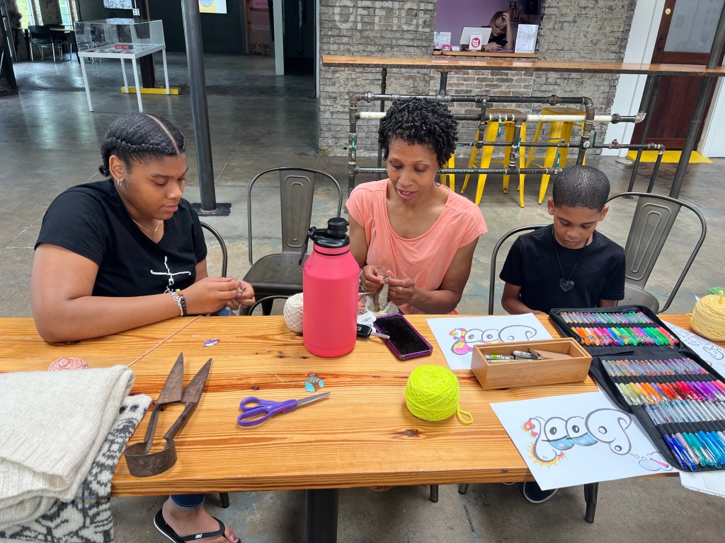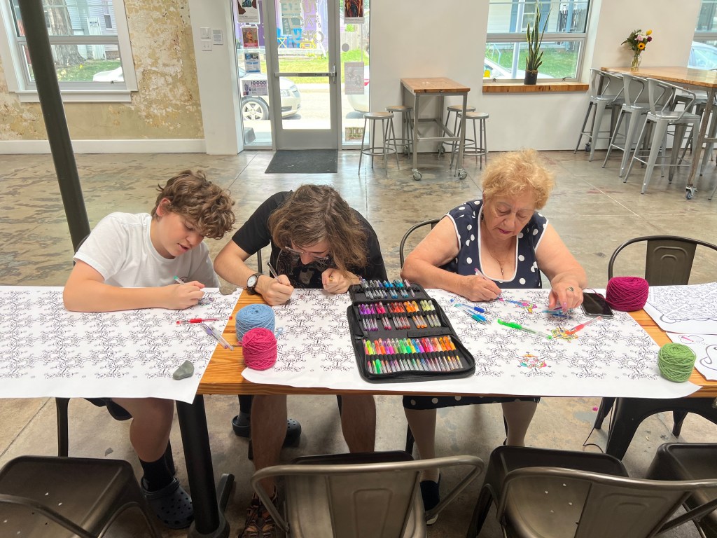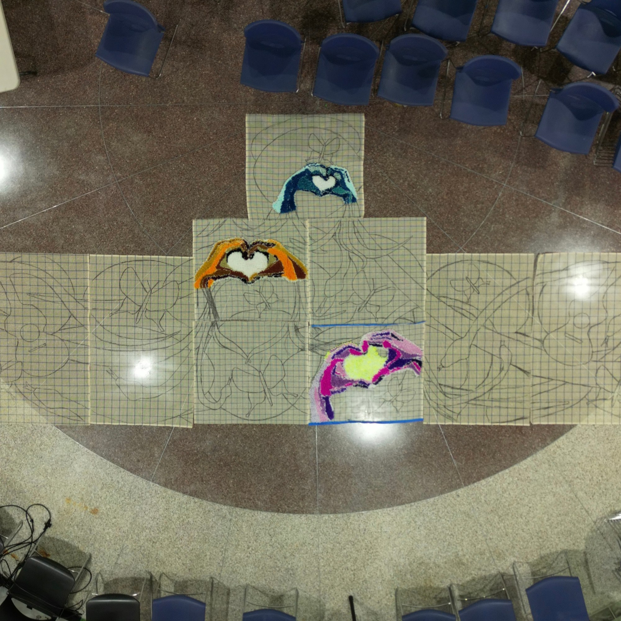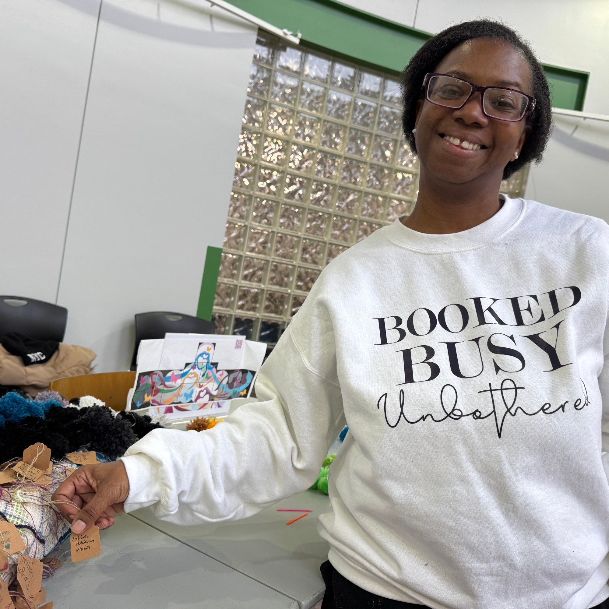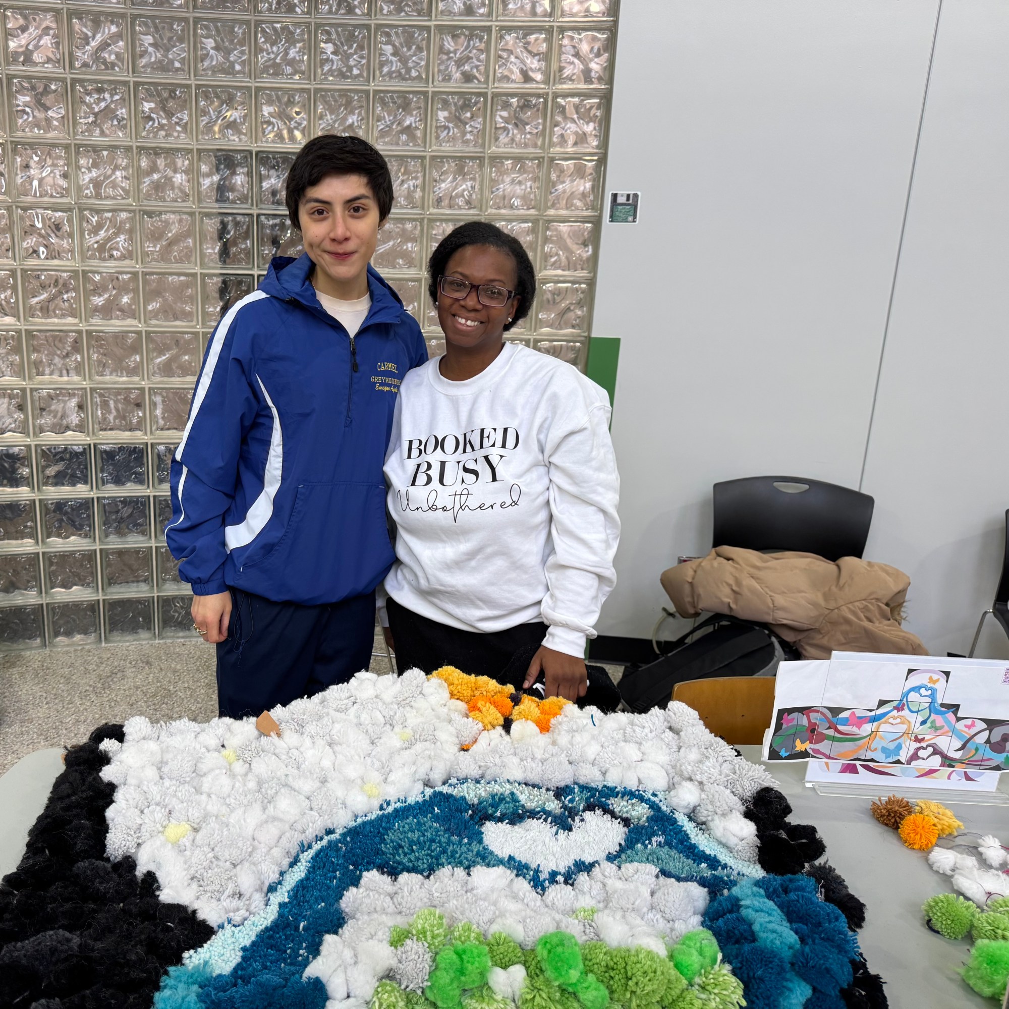 The brown pieces of paper on the back are names, dates, and sometimes messages written by participants. Individuals from all over Indianapolis made these pompoms and attached them to the canvases. This is the community’s record of and unity and creativity.