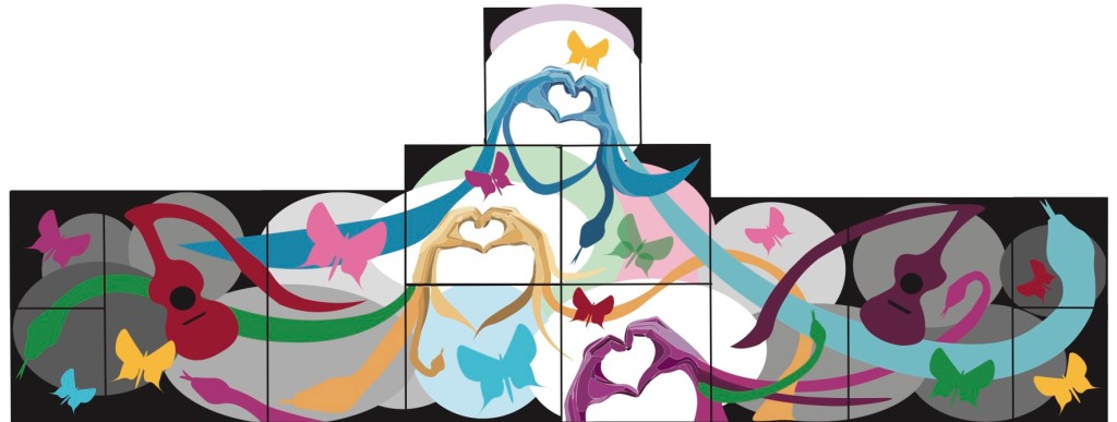 There are a lot of symbols in The Village. Some obvious and some not so much. The heart hands are a known quantity and the focal point of the art work. They are a contemporary symbol popularized by Taylor Swift. When I designed the piece, I wanted to include things people who were in Indy for the Eras Tour would recognize. Even though that event is over, the heart hands are staying because the art and my intention are about diverse community coming together, good will, and people’s ability to create.