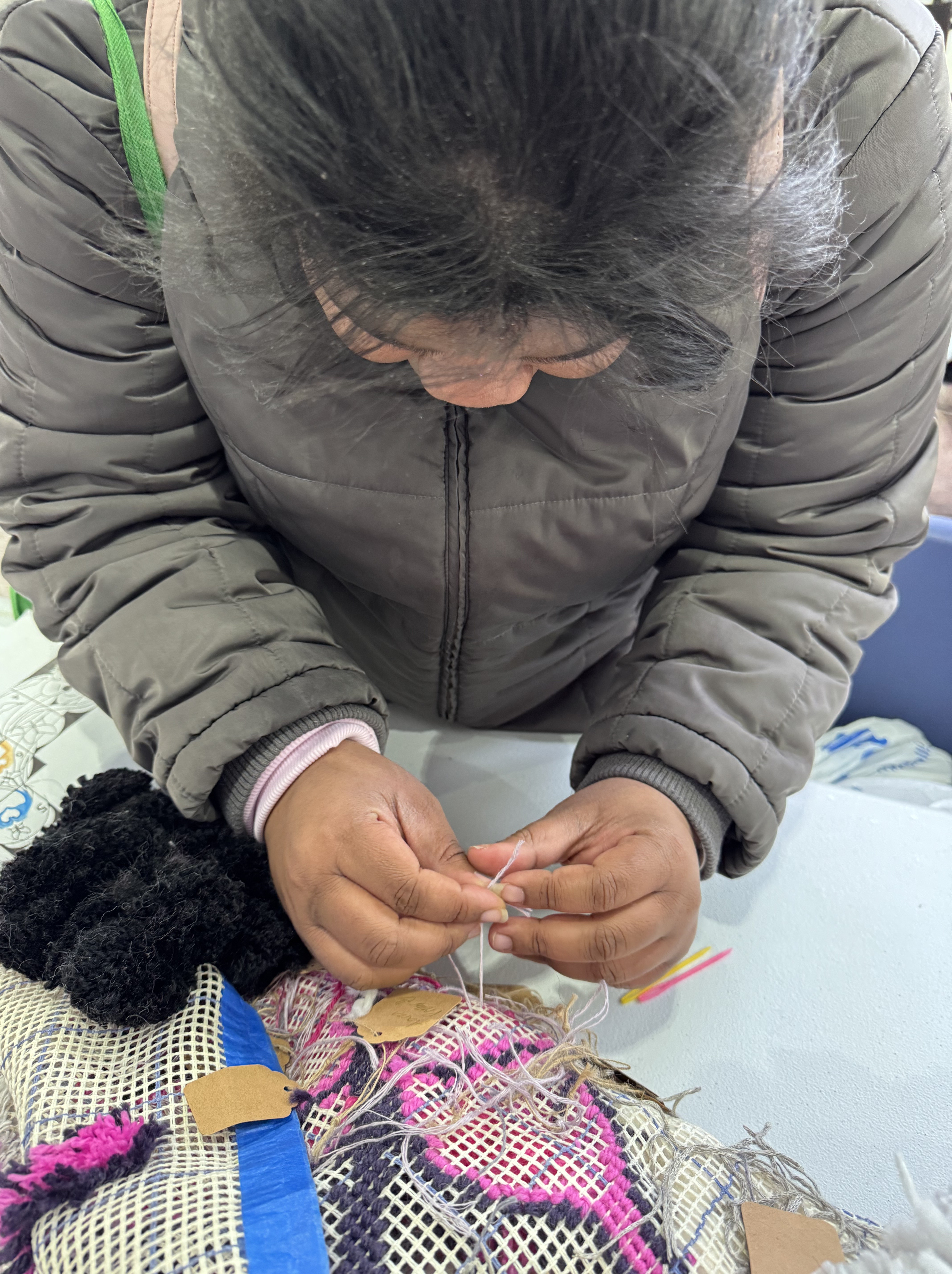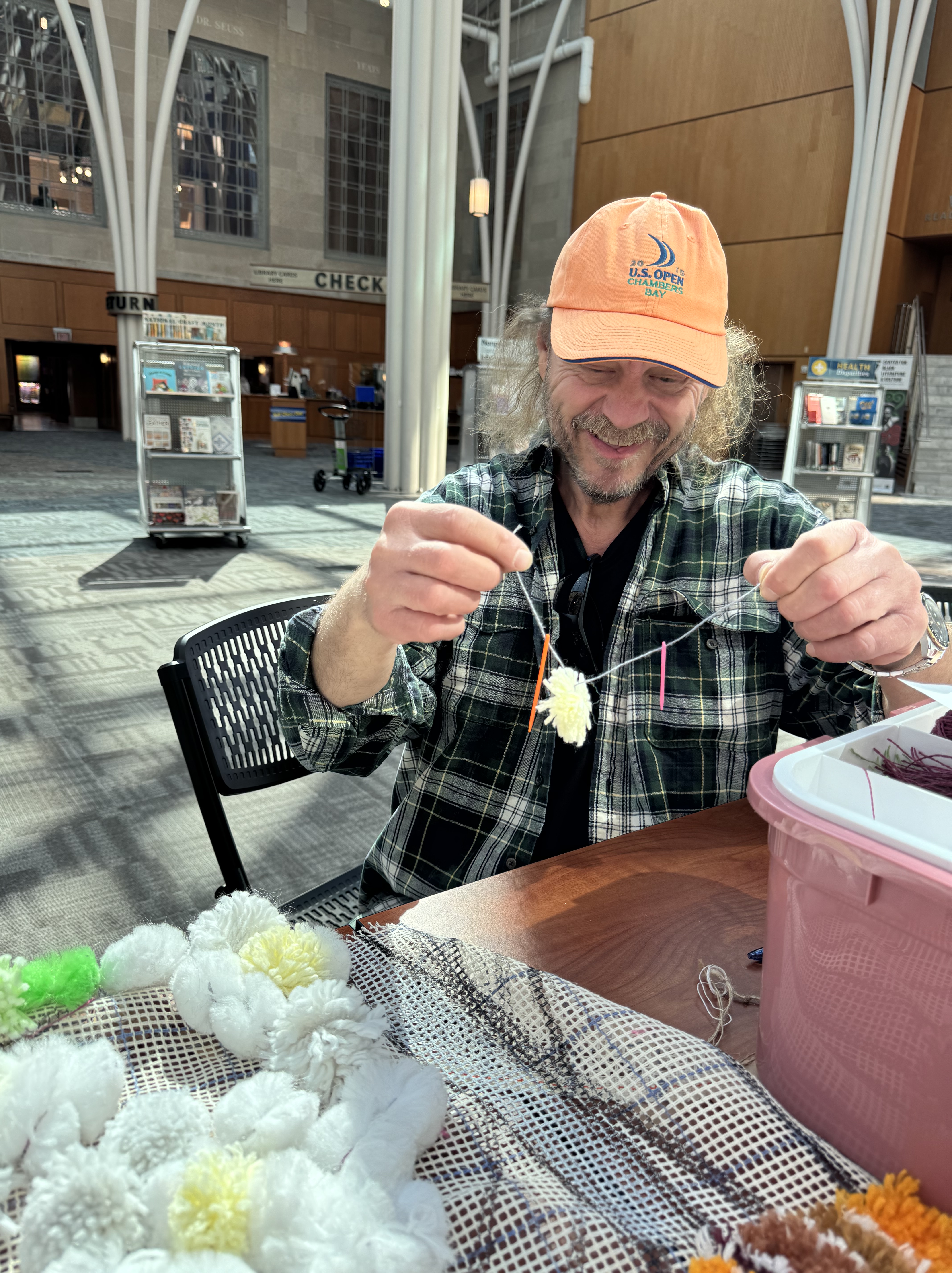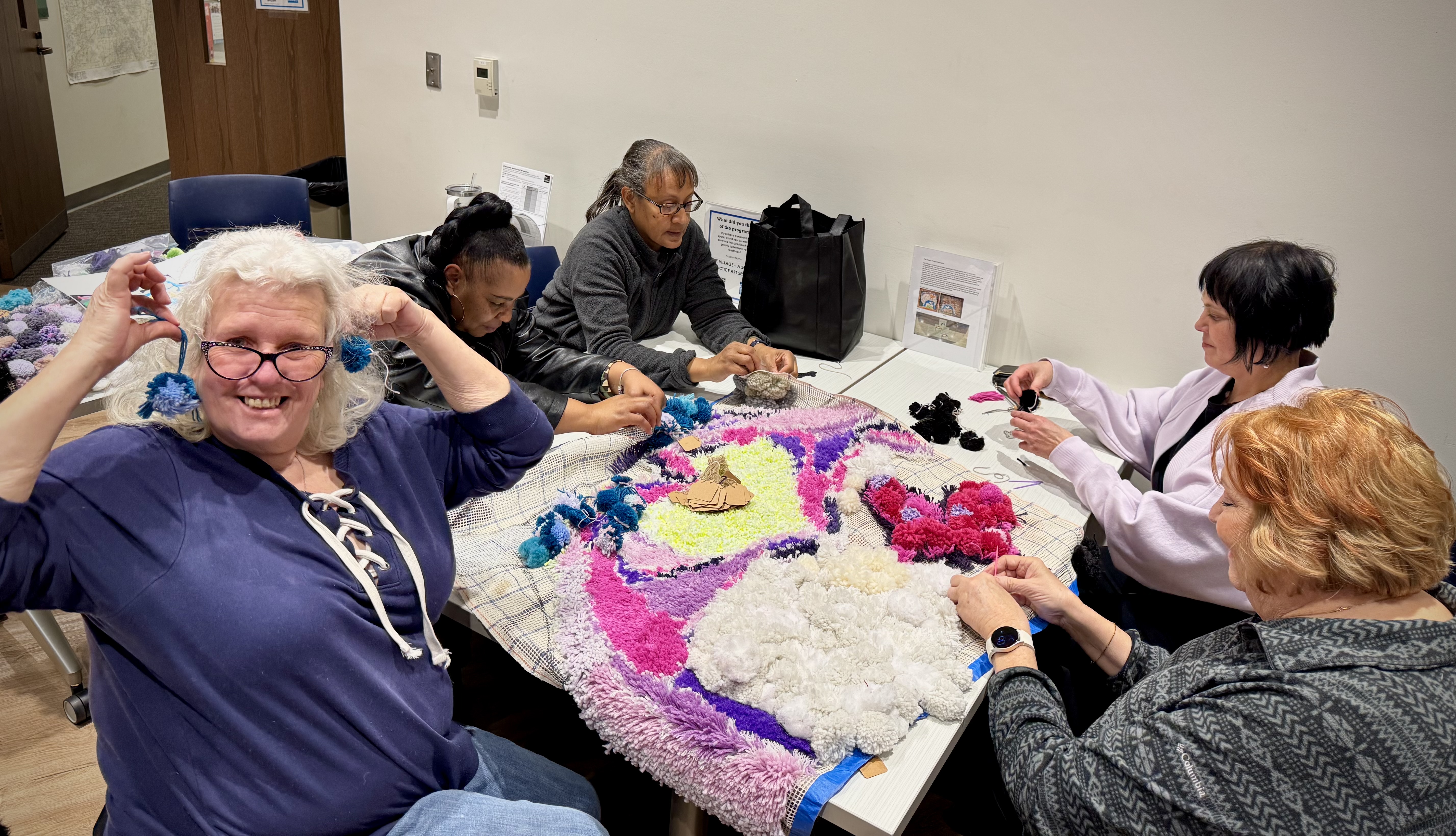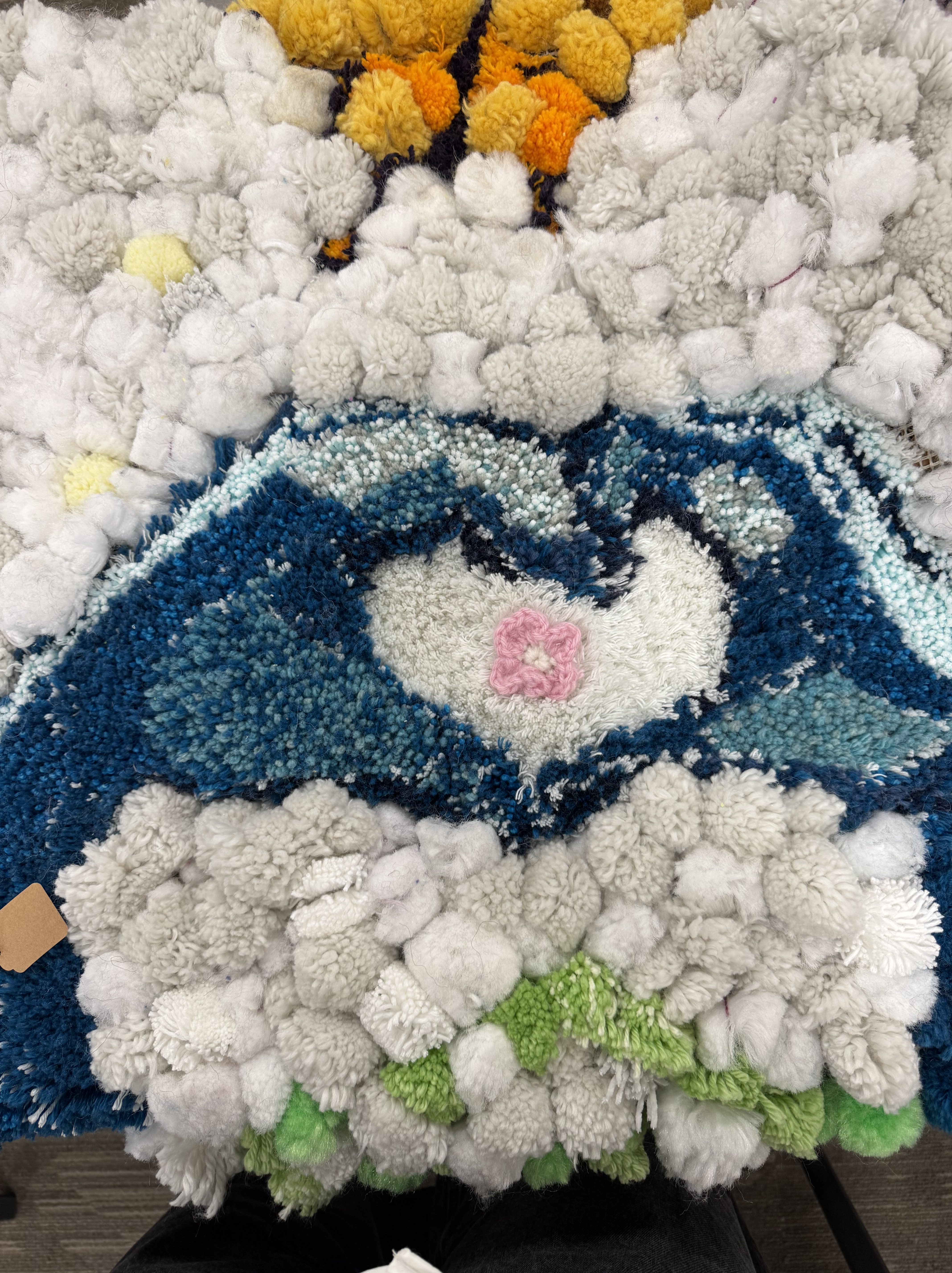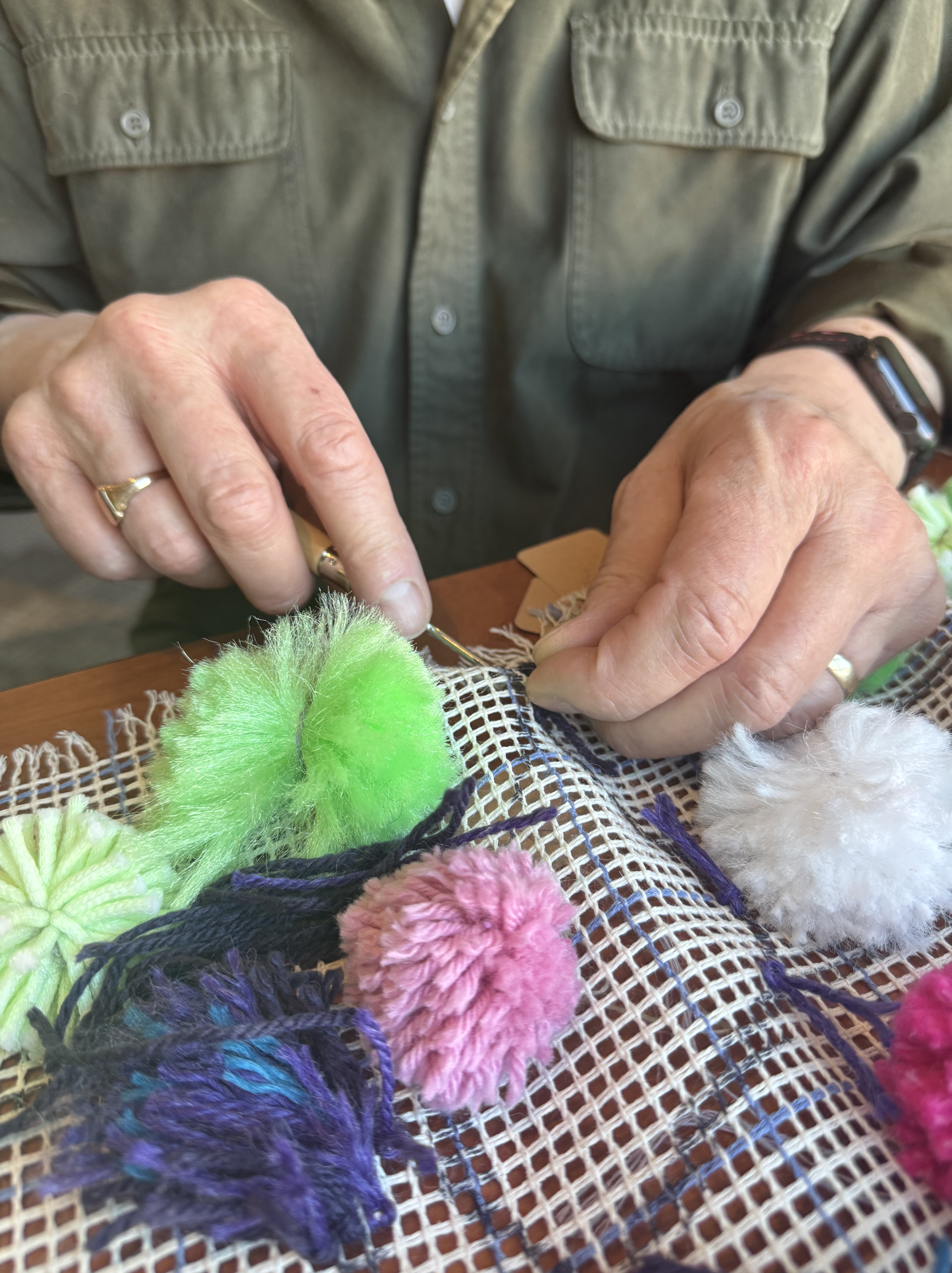 A new pack of tags was purchased this month, which means 500 tags are on three Village panels! That’s big news! These next few weeks are going to include more pompom making because supplies are running low. I’ve decided to incorporate more fiber arts techniques into the whole thing (crochet flowers for instance) and more latch hook as well. The latch hook areas really stand out on the back of the panels, and really, the art part is where the name tags are.