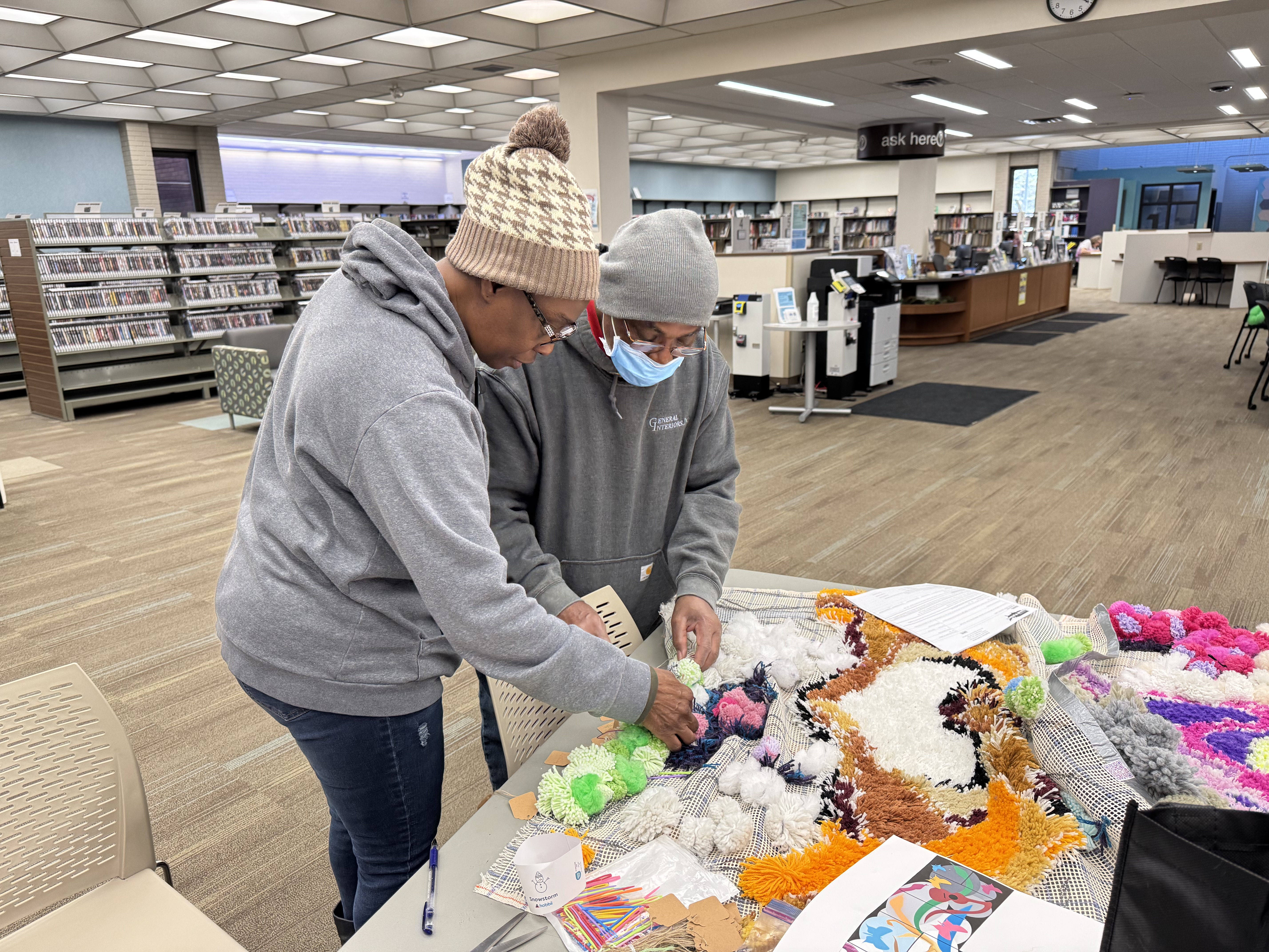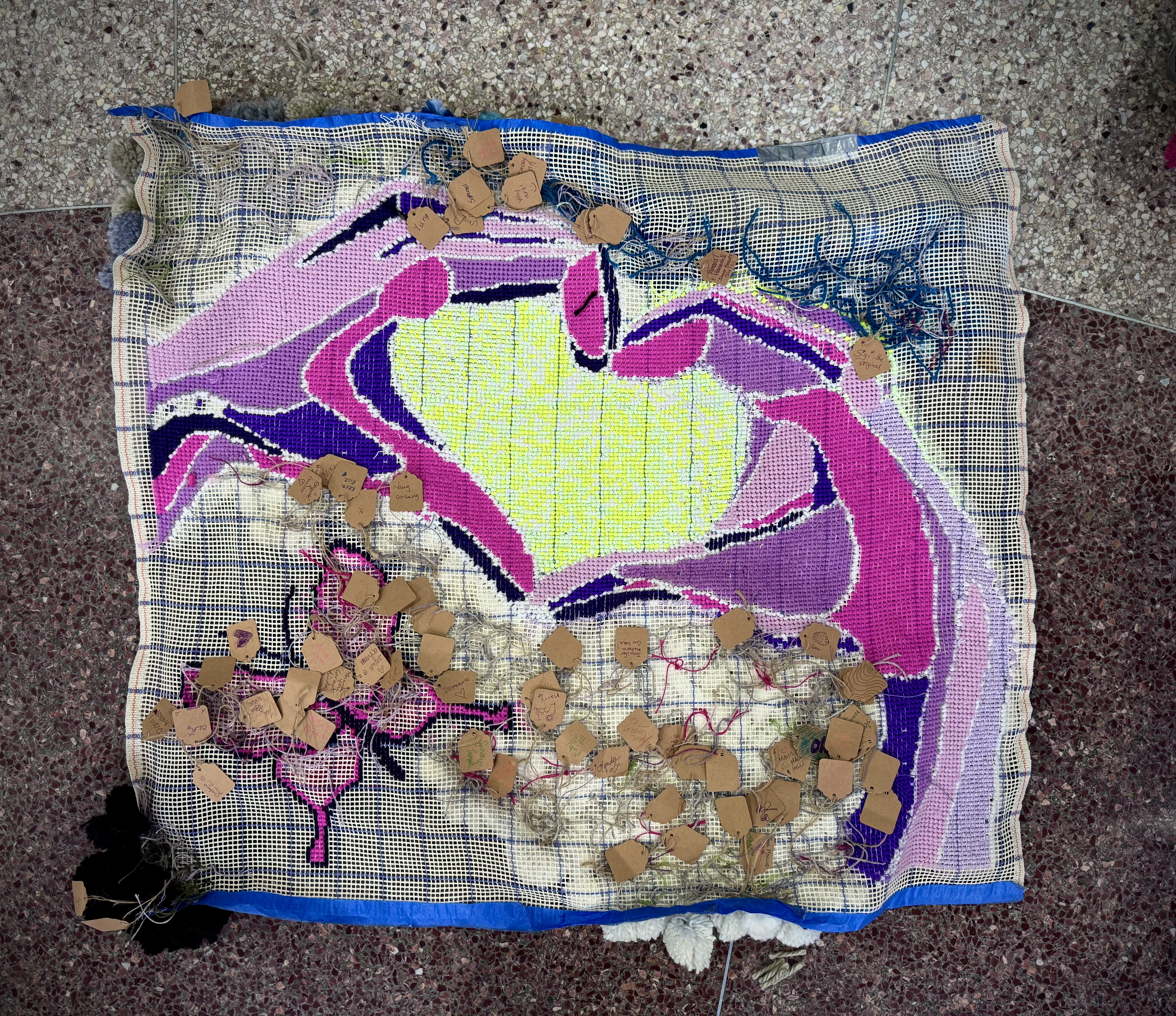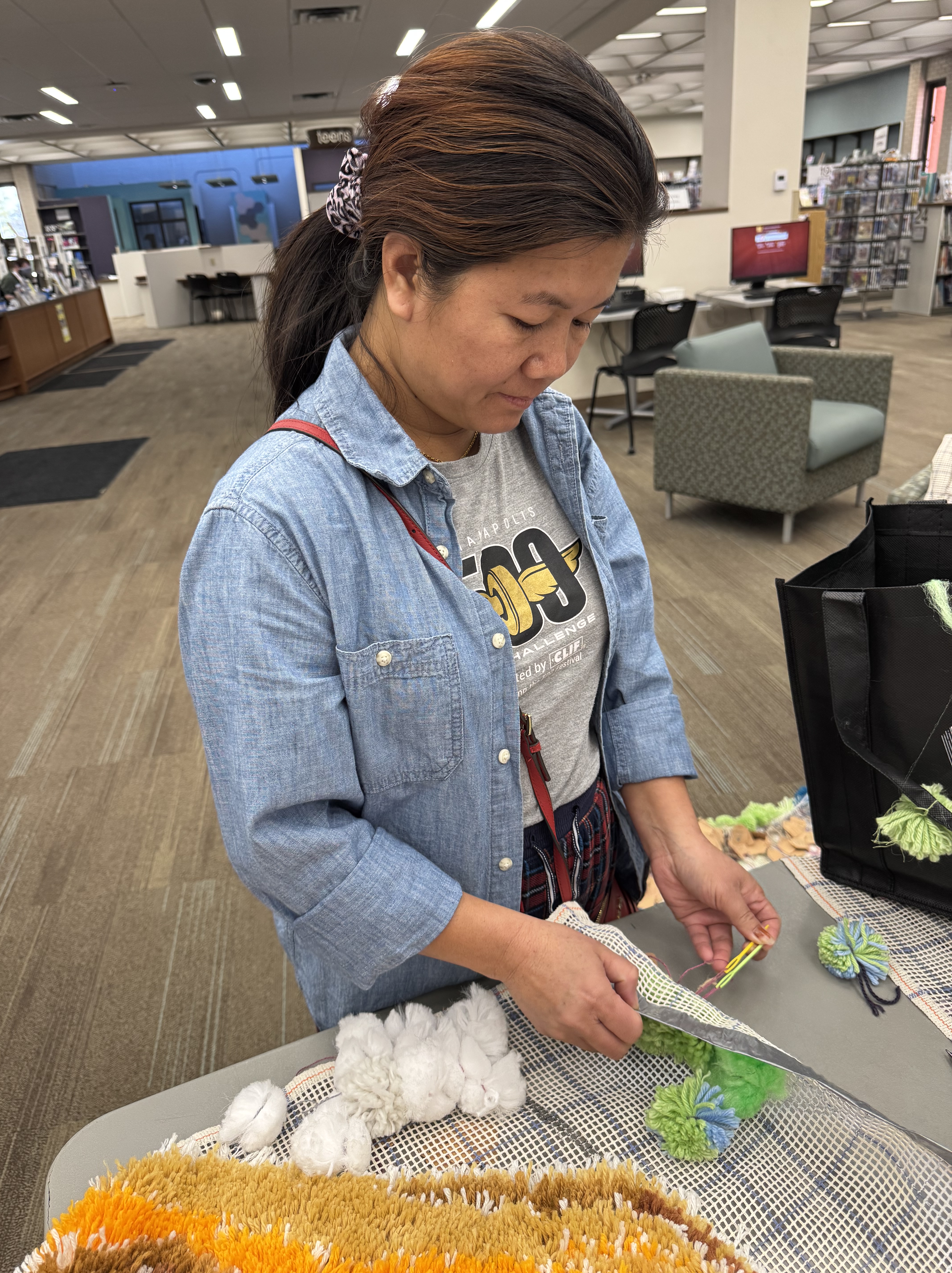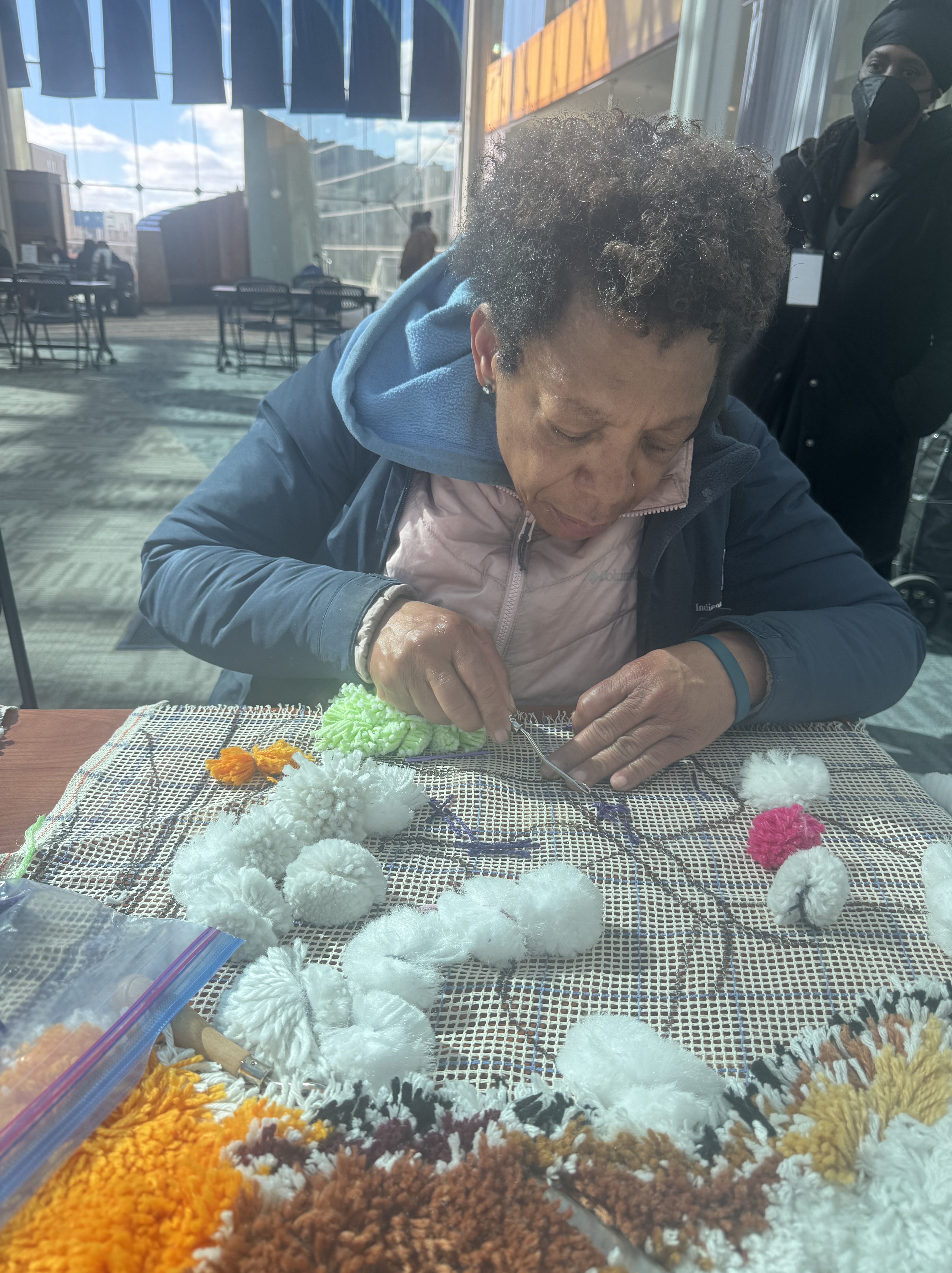 A new pack of tags was purchased this month, which means 500 tags are on three Village panels! That’s big news! These next few weeks are going to include more pompom making because supplies are running low. I’ve decided to incorporate more fiber arts techniques into the whole thing (crochet flowers for instance) and more latch hook as well. The latch hook areas really stand out on the back of the panels, and really, the art part is where the name tags are.