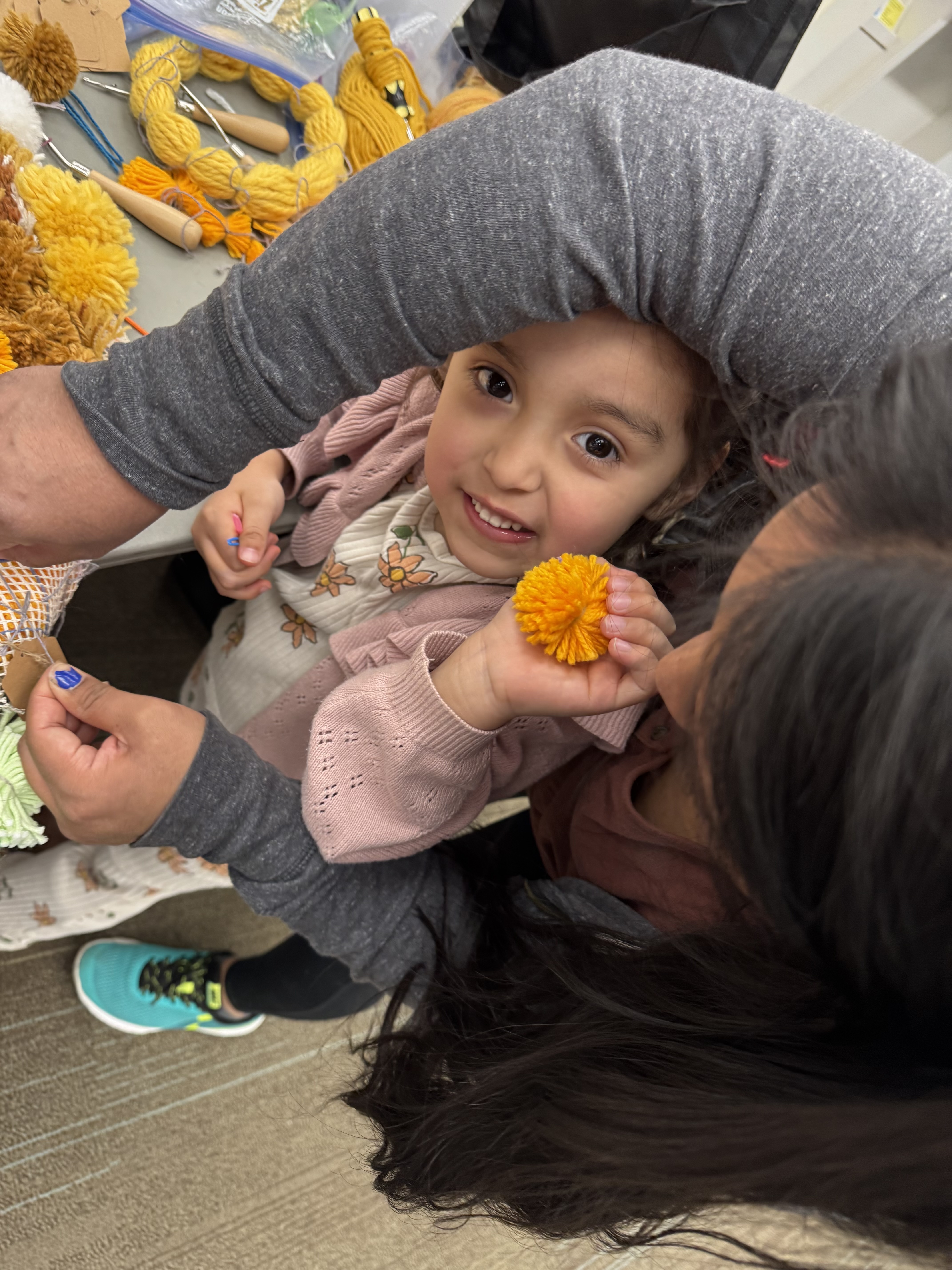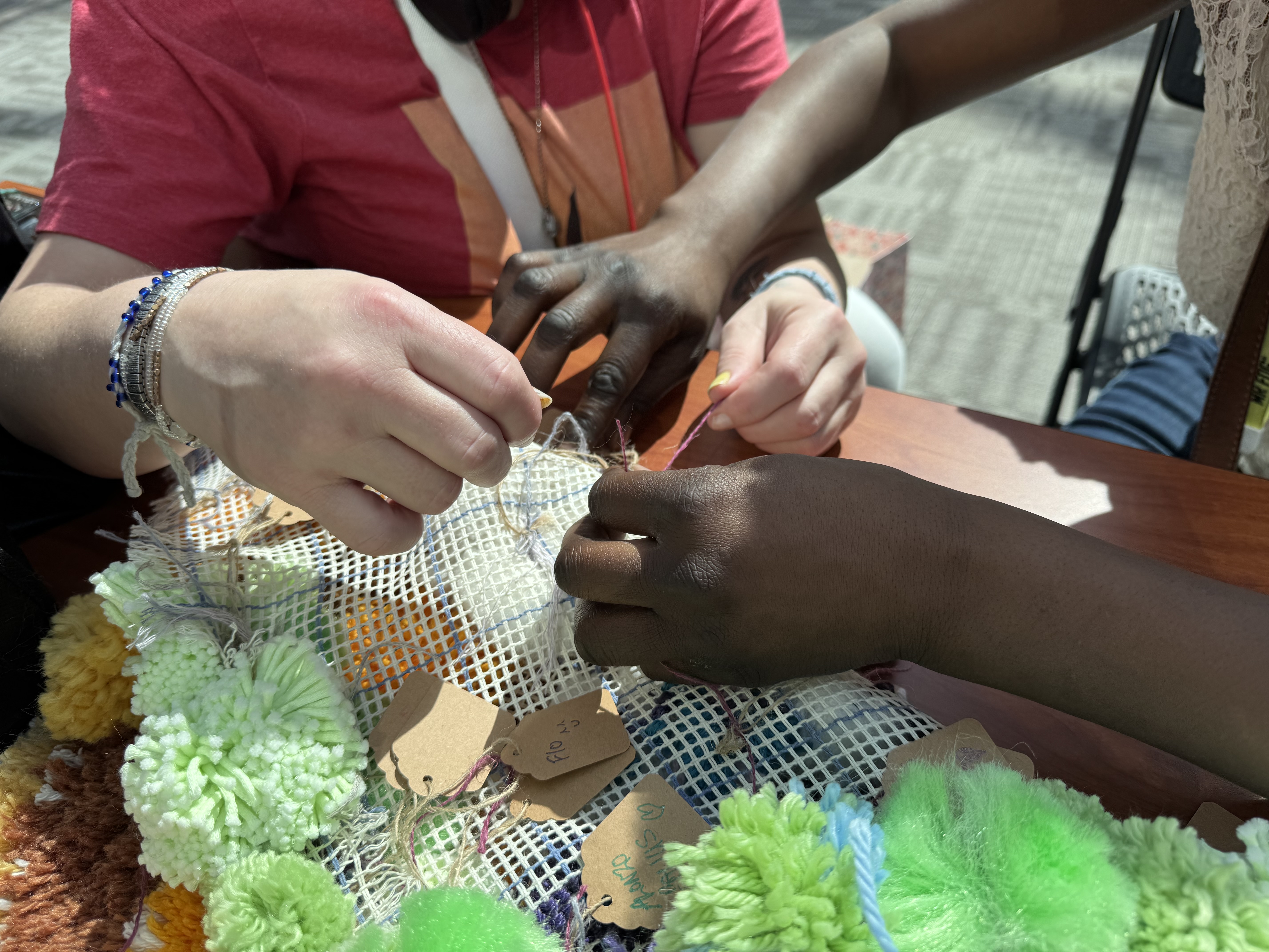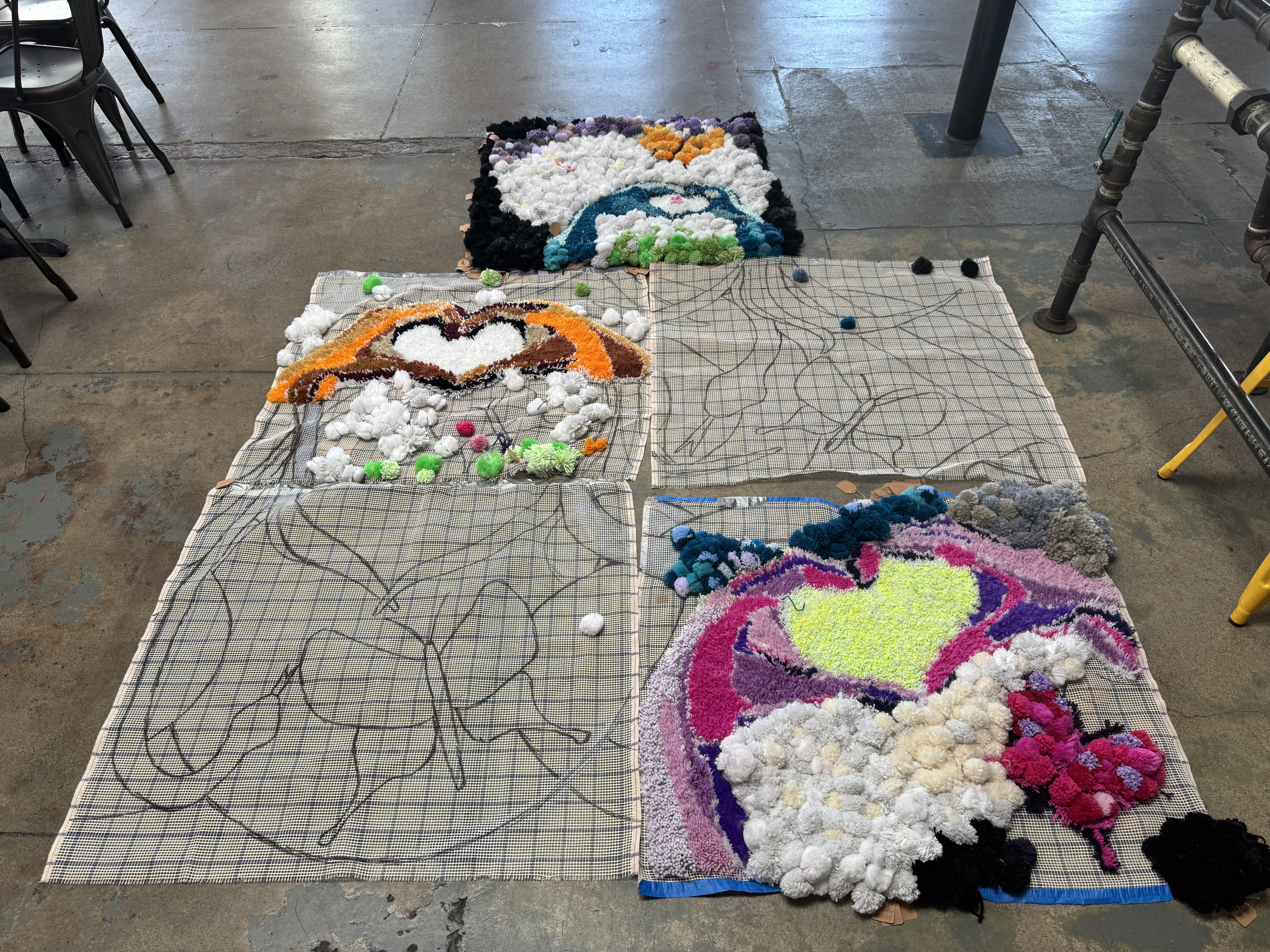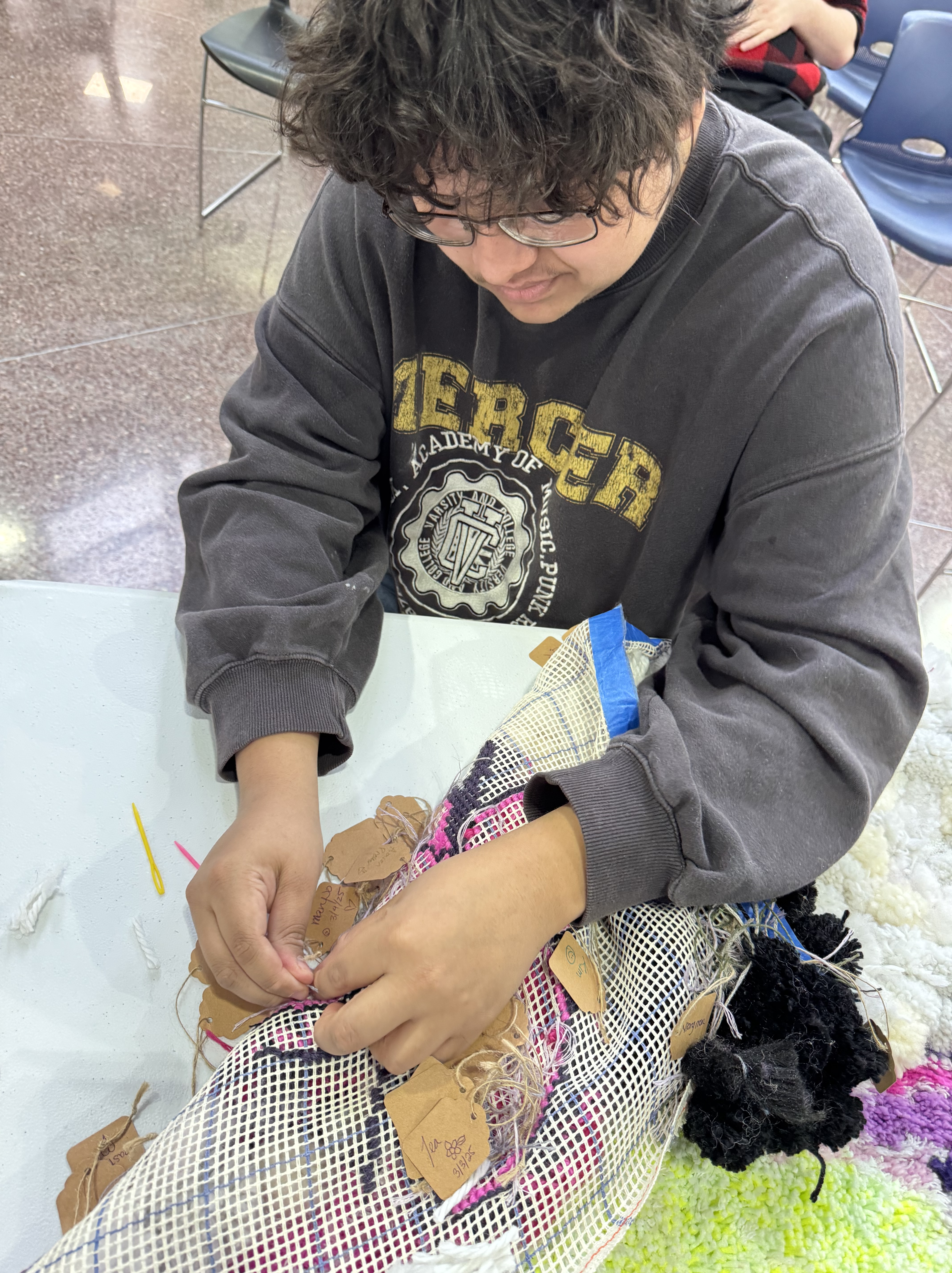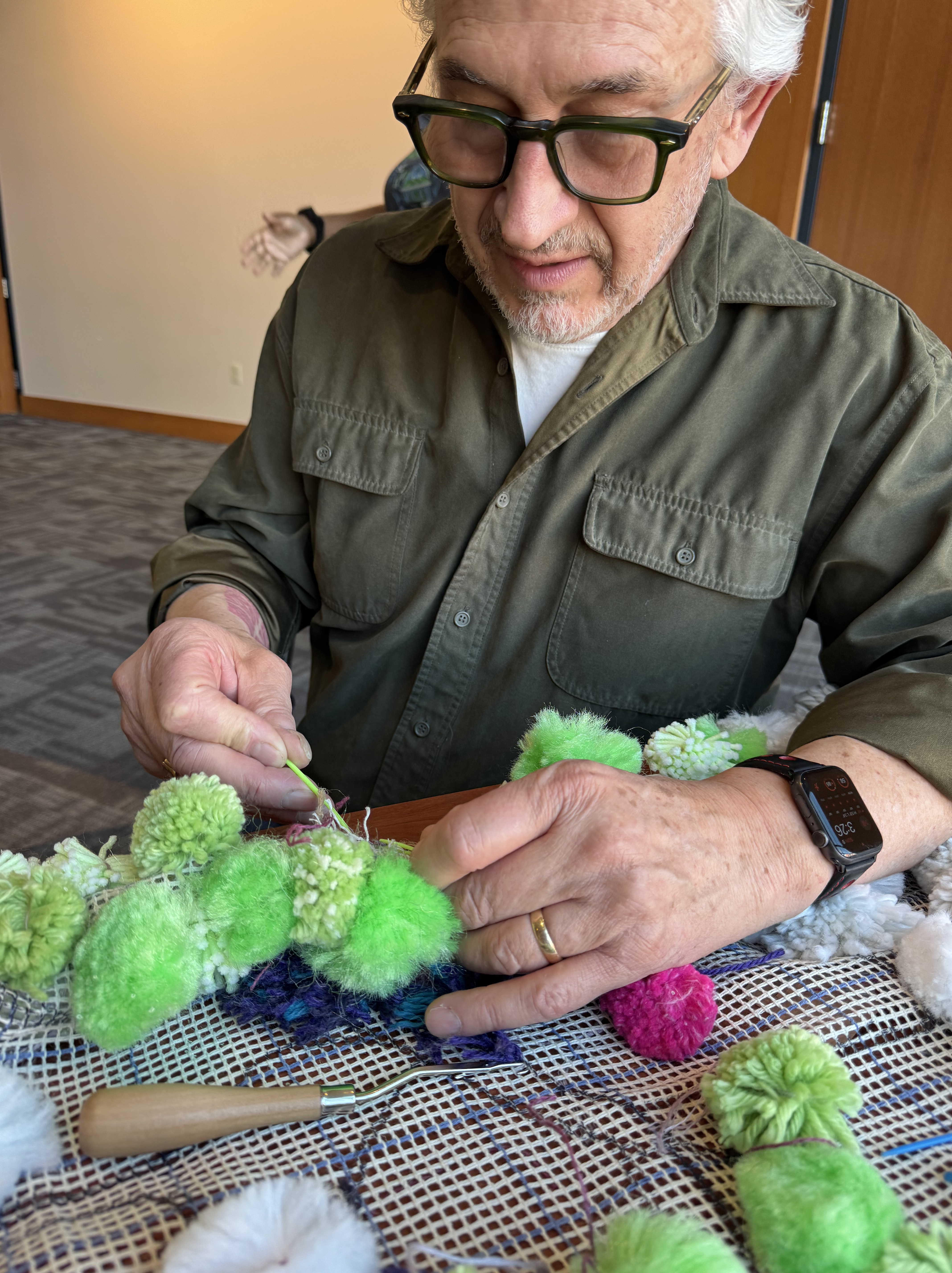 A new pack of tags was purchased this month, which means 500 tags are on three Village panels! That’s big news! These next few weeks are going to include more pompom making because supplies are running low. I’ve decided to incorporate more fiber arts techniques into the whole thing (crochet flowers for instance) and more latch hook as well. The latch hook areas really stand out on the back of the panels, and really, the art part is where the name tags are.