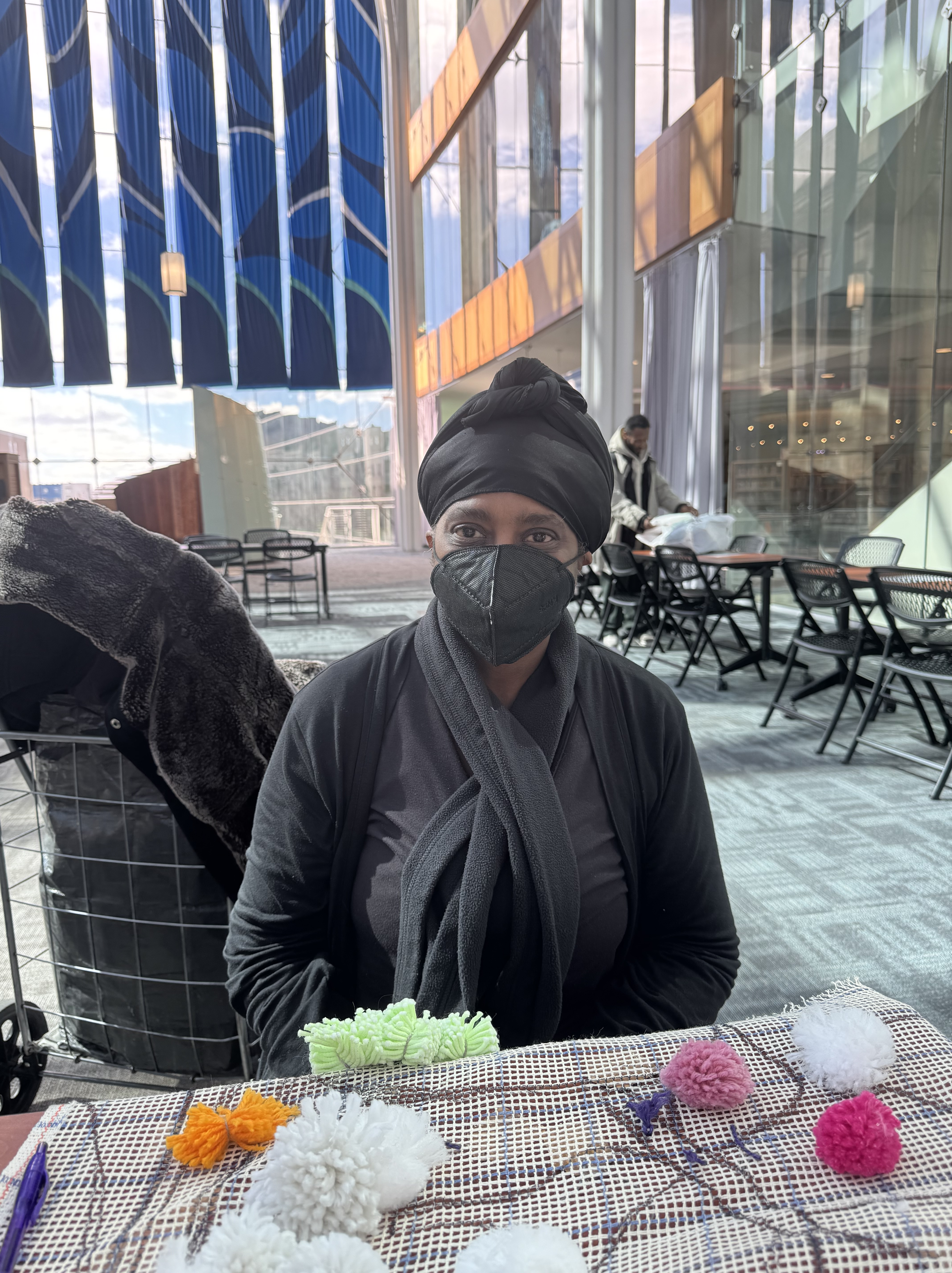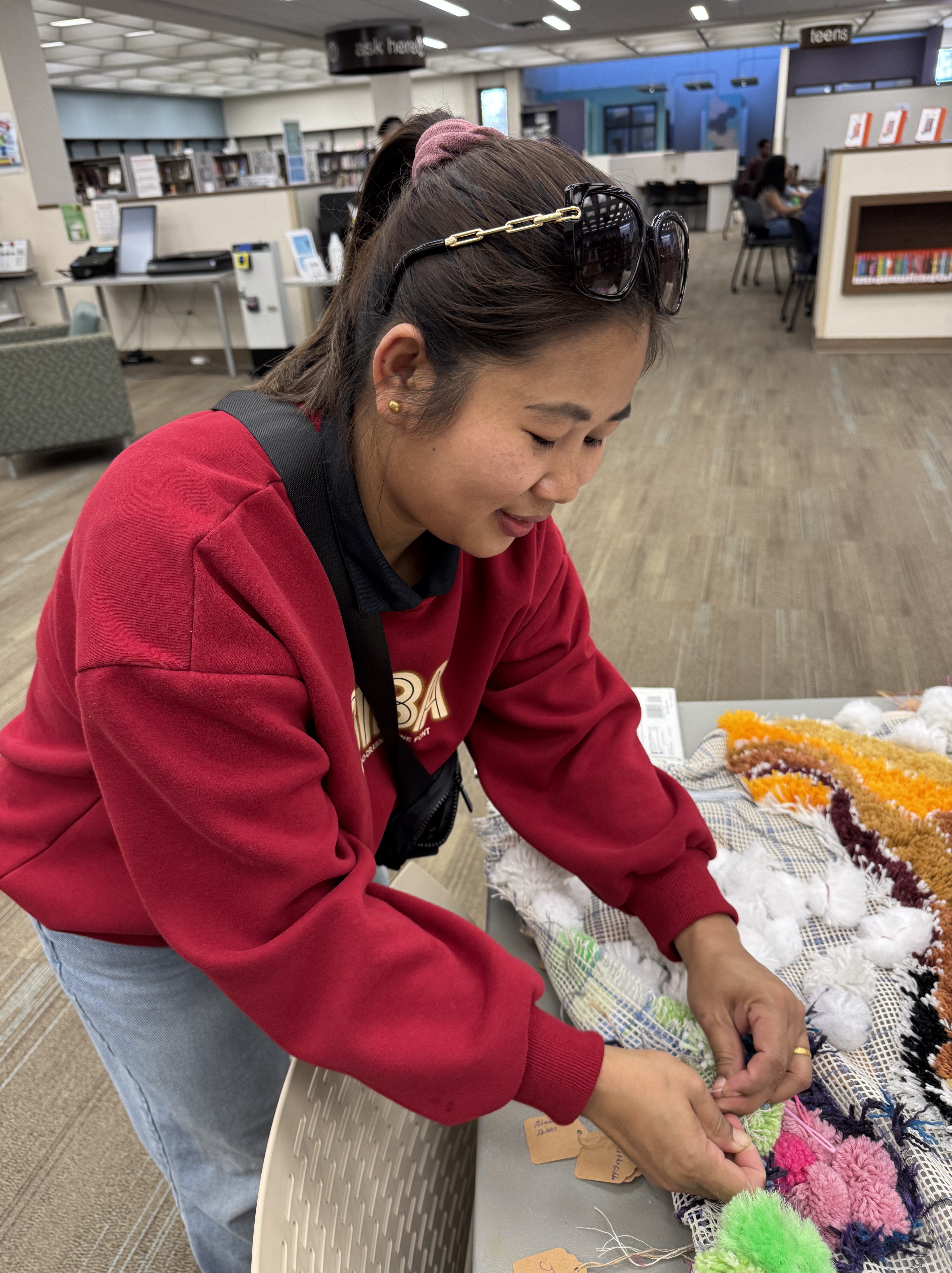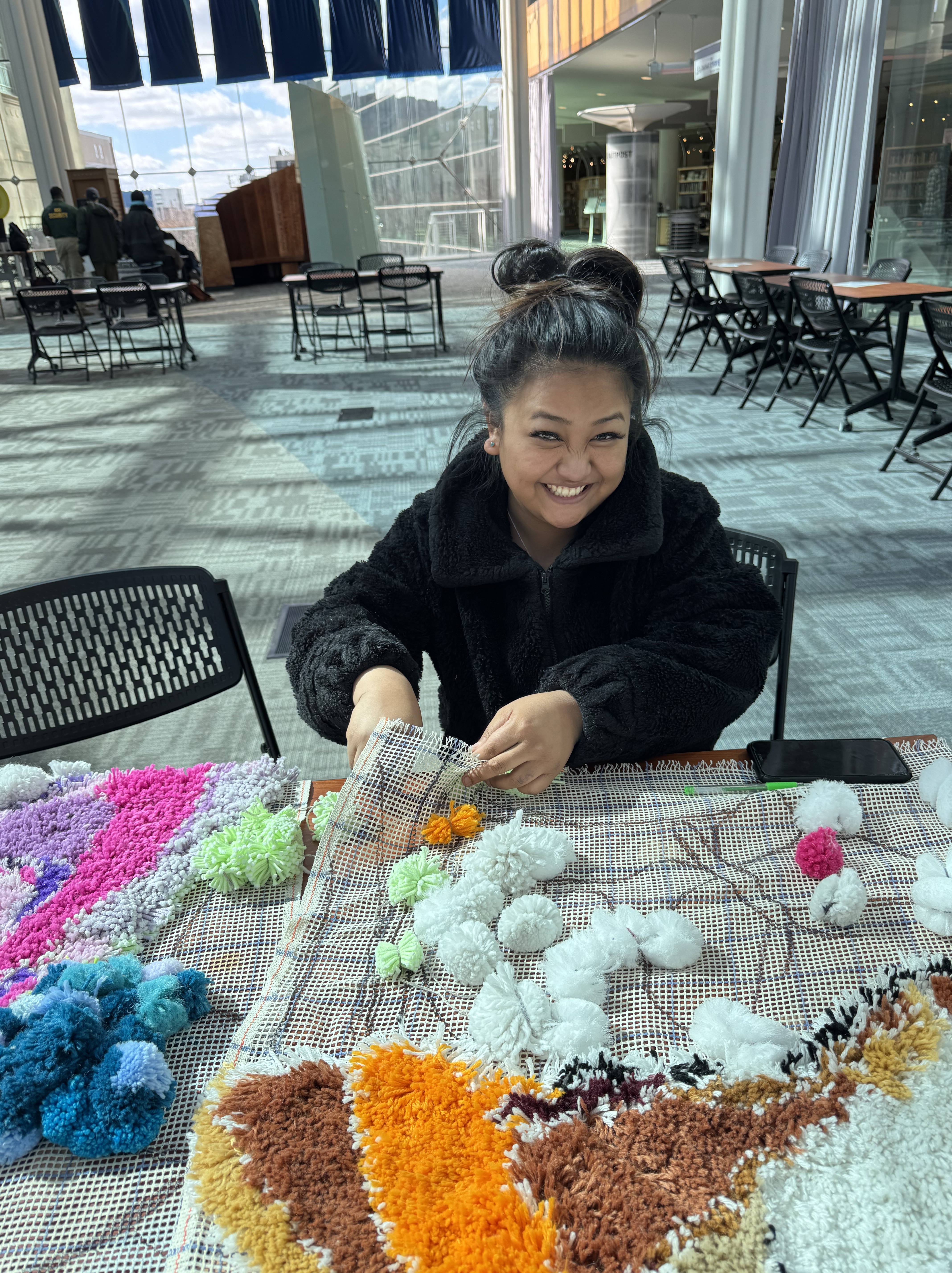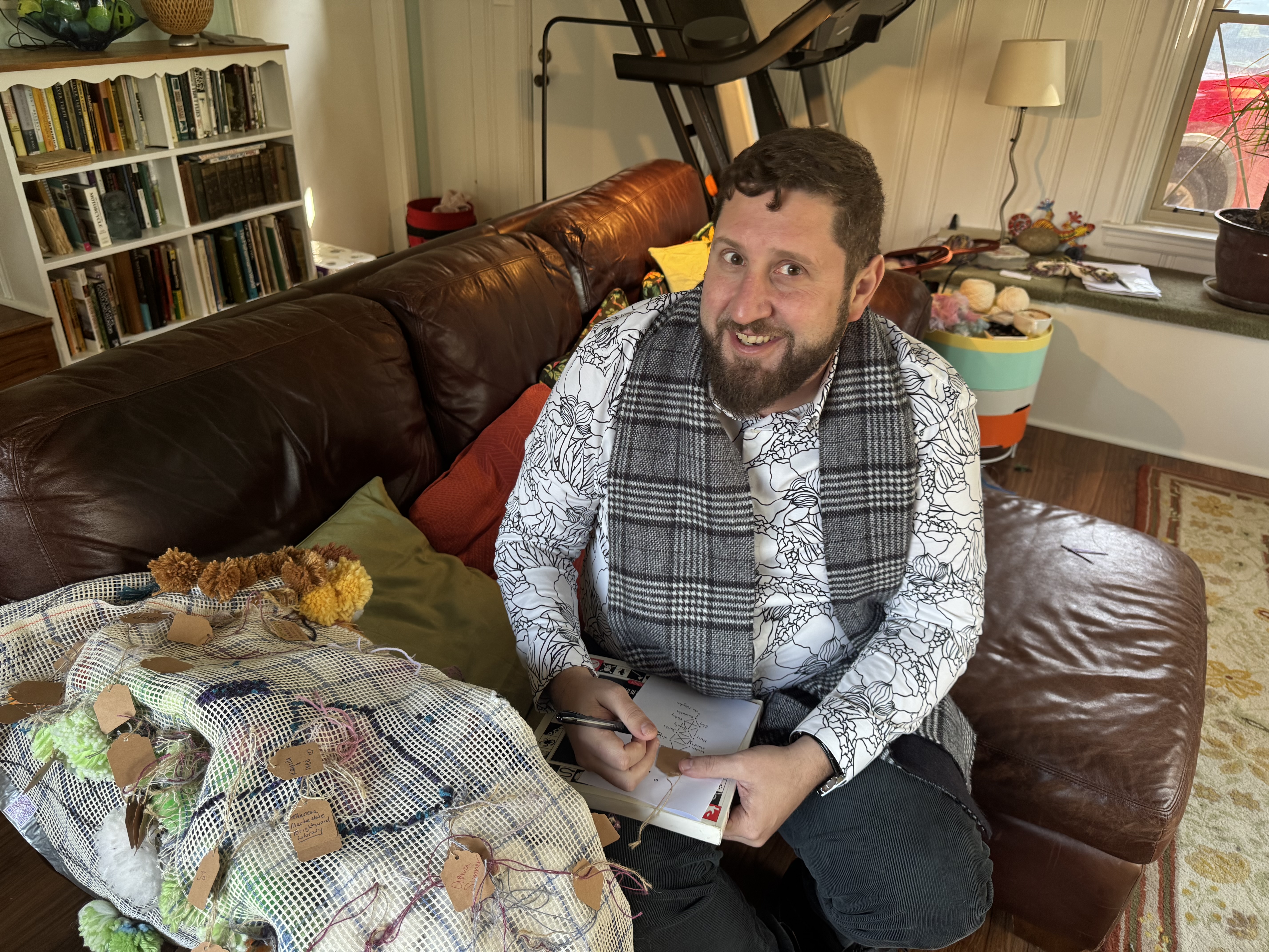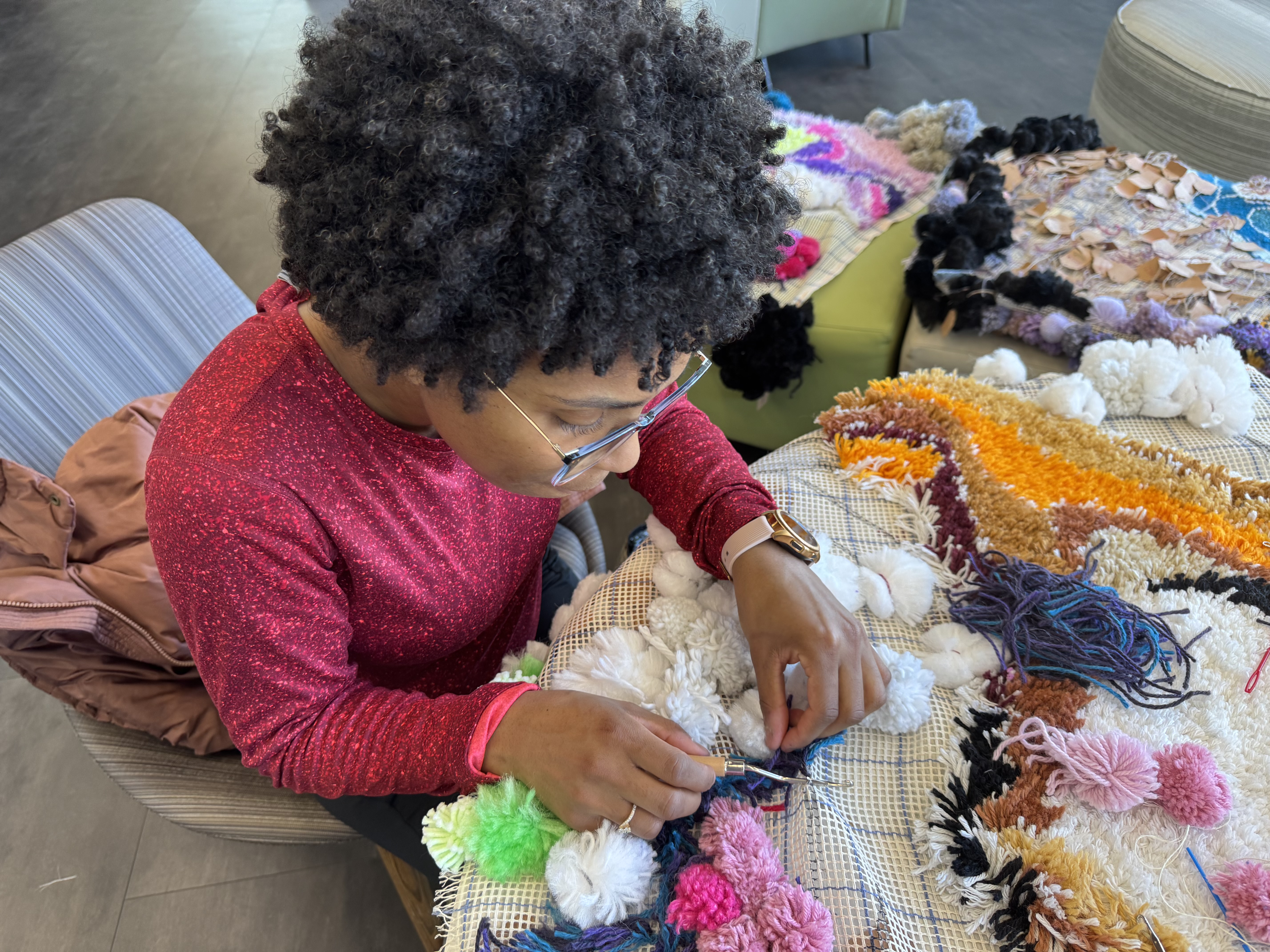 A new pack of tags was purchased this month, which means 500 tags are on three Village panels! That’s big news! These next few weeks are going to include more pompom making because supplies are running low. I’ve decided to incorporate more fiber arts techniques into the whole thing (crochet flowers for instance) and more latch hook as well. The latch hook areas really stand out on the back of the panels, and really, the art part is where the name tags are.