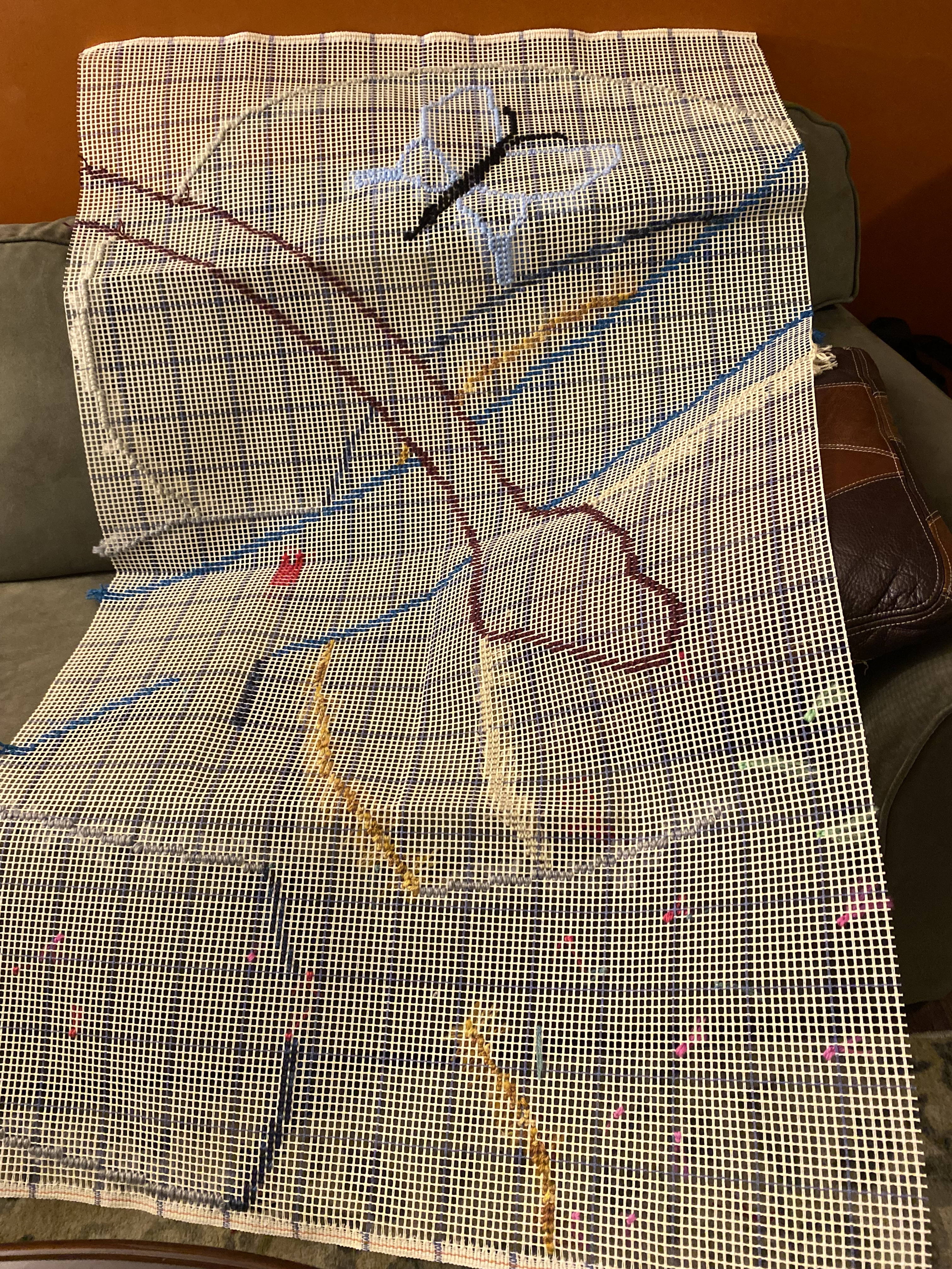 Like a lot of things worth doing, The Village is a communal effort. Special thanks to Cheryl and Patty for doing the latch hook outlines on the next two panels of the Village! Both sides of the artwork are important. I discovered latch hook is necessary not just for details too small for pompoms. It is also essential for the appearance of the design on the back.