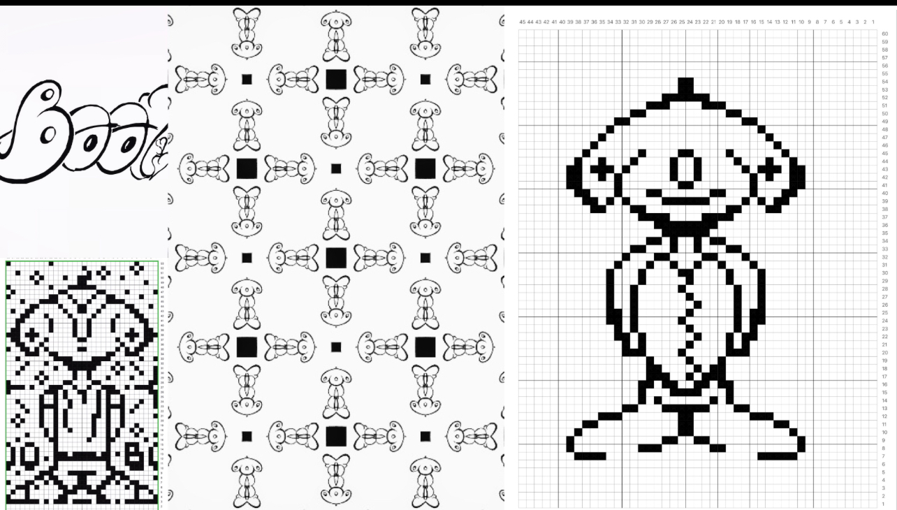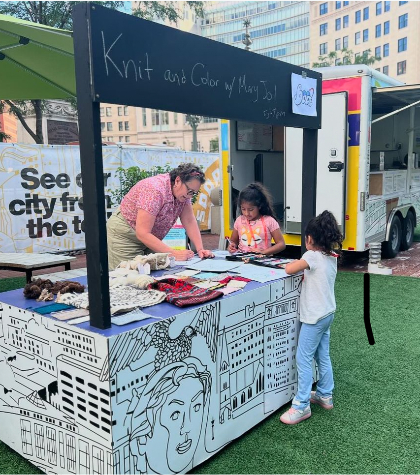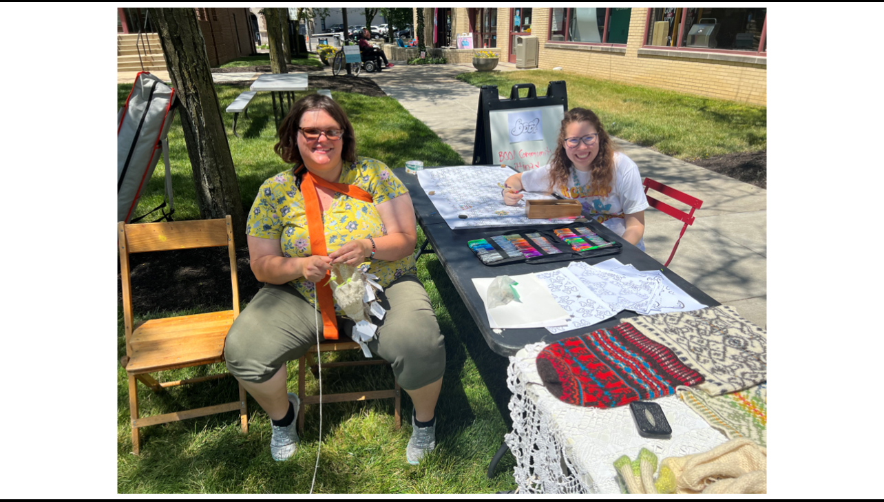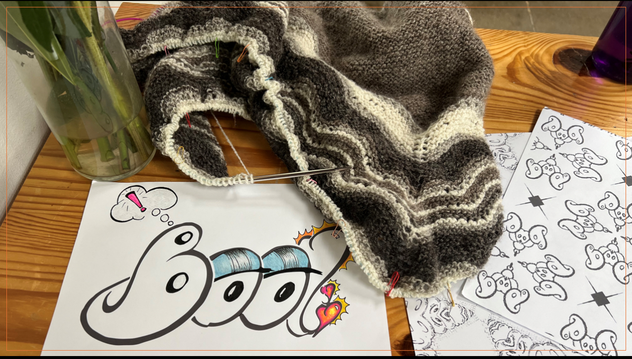Below is the image of my traditional Shetland Hap Shawl in progress, with coloring sheets I made on Adobe Capture from the word “boo”, inspired by my time teaching young artists in South Indy.